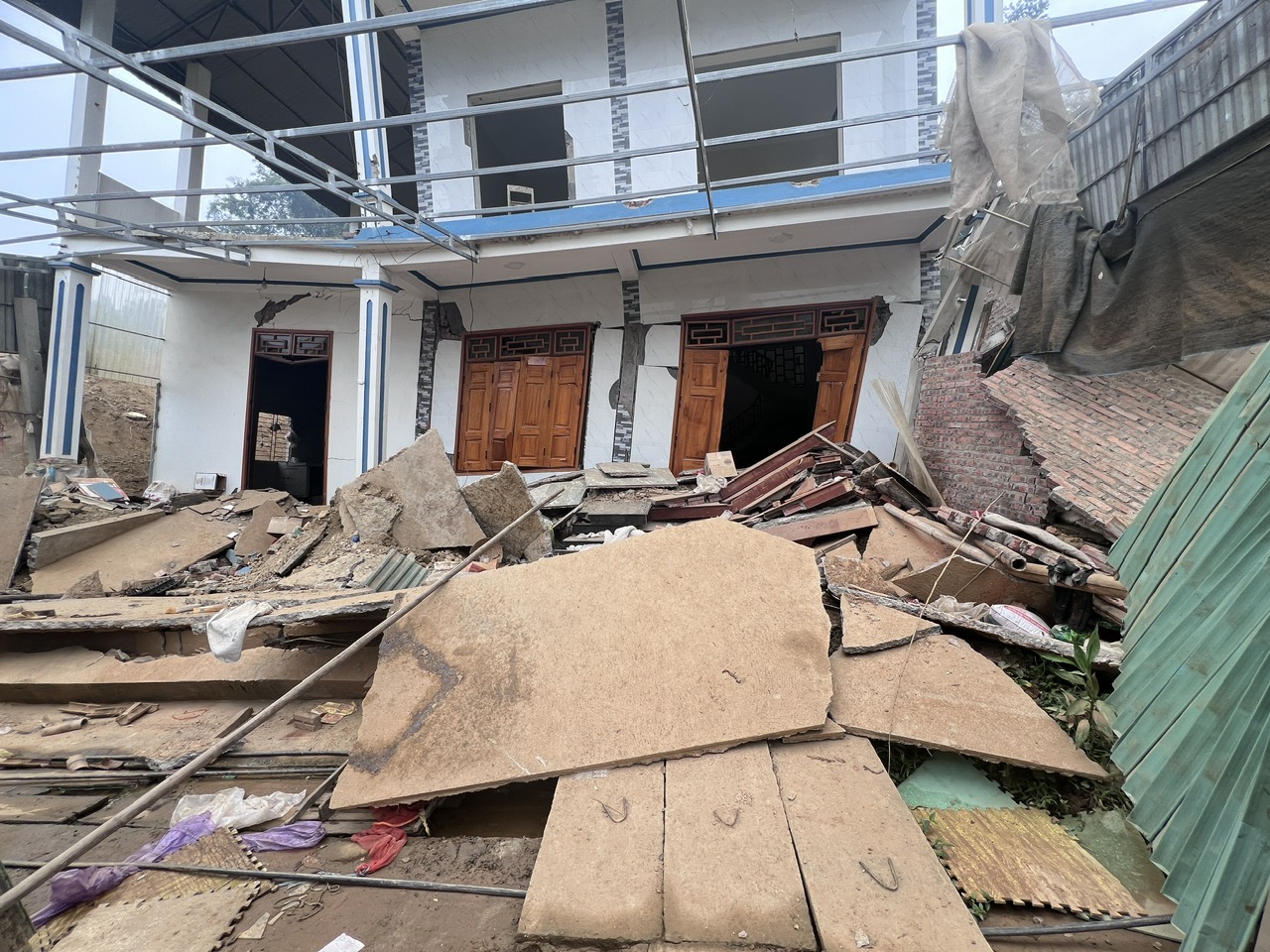(Ngôi nhà của người dân tại thôn Pác Nghè, xã Chợ Rã đang trong quá trình xây dựng bị đổ sập do đất đá sạt trượt)